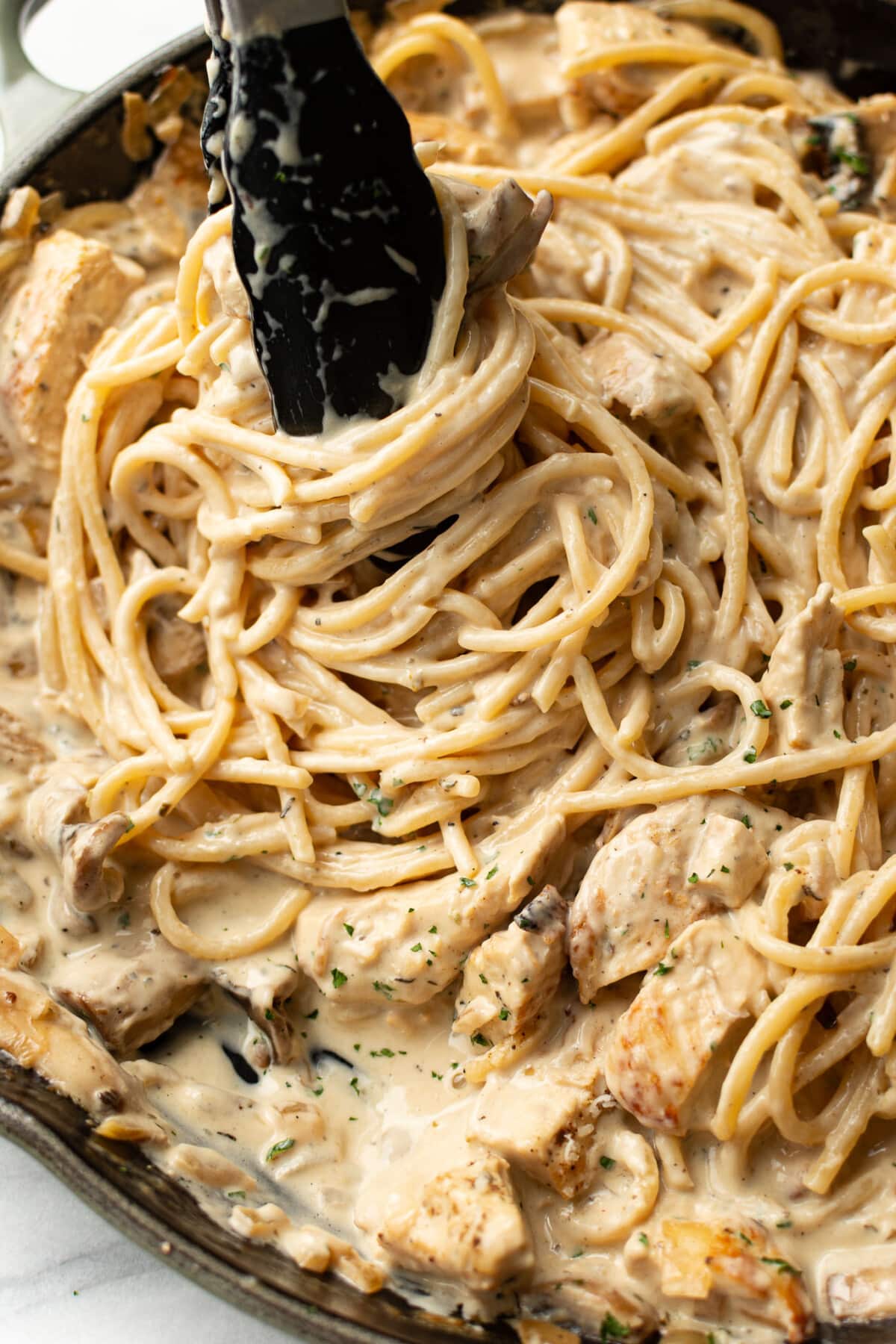 This creamy chicken and mushroom pasta recipe pairs sautéed garlic herb mushrooms with tender chicken and spaghetti in an elegant sauce! It’s a fantastic 35-minute meal.