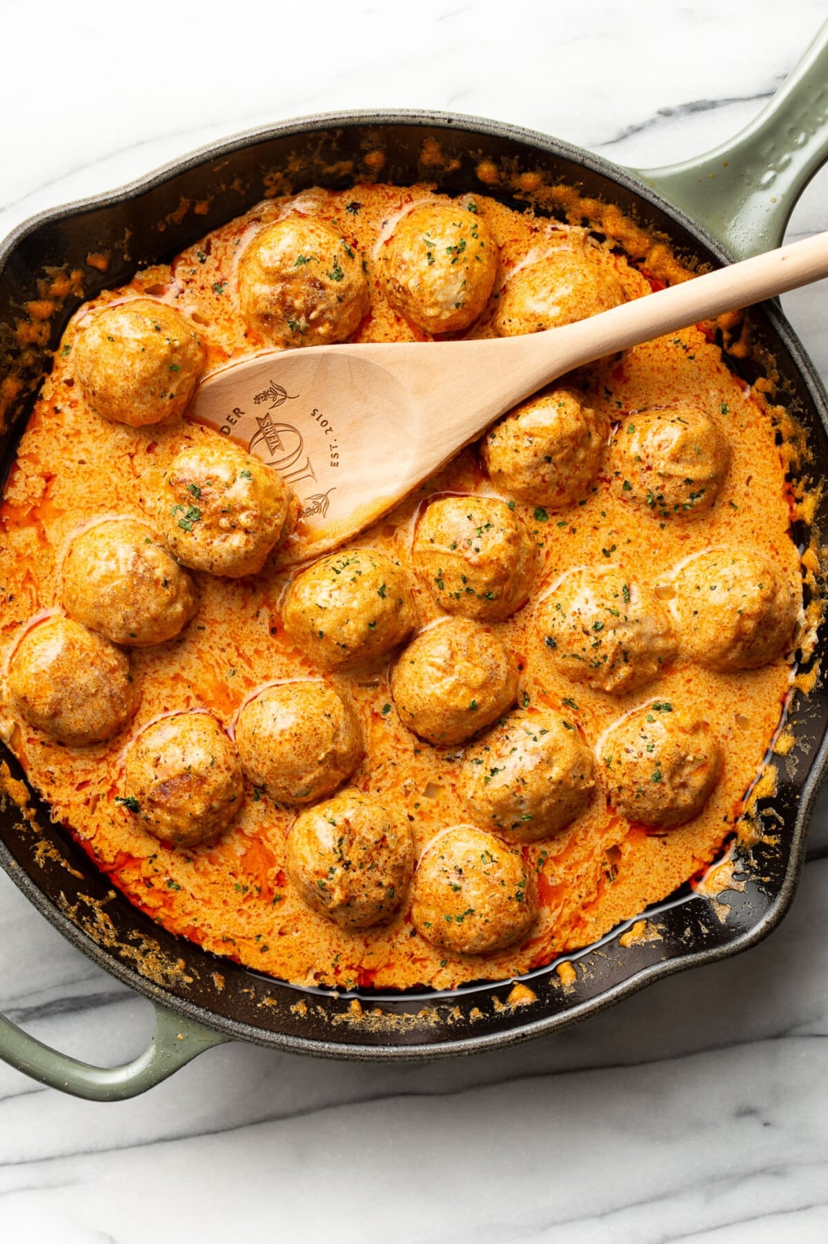 • Once the sauce is simmering, add the meatballs back to the pan. Cook the meatballs for 8-10 minutes or until they're cooked through (165F). Don't let the sauce bubble too much or it may curdle. Season with extra salt & pepper as needed.