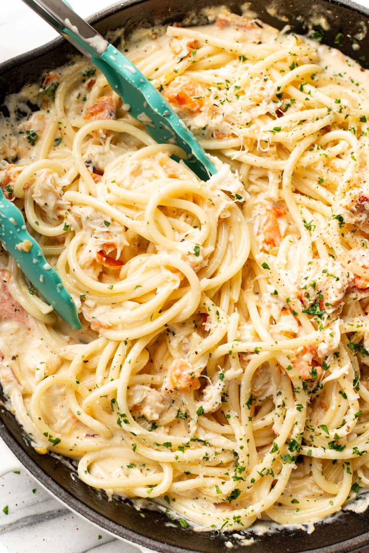 tossing crab with pasta and sauce in a skillet