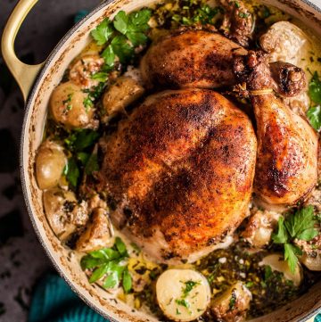 This creamy whole roasted chicken is moist and juicy, and the potatoes melt in your mouth. It’s a one pot meal that might just be the tastiest thing you’ll make in your Dutch oven. Maybe my favorite part is how it’s really, really easy to make for a beautiful Sunday dinner!