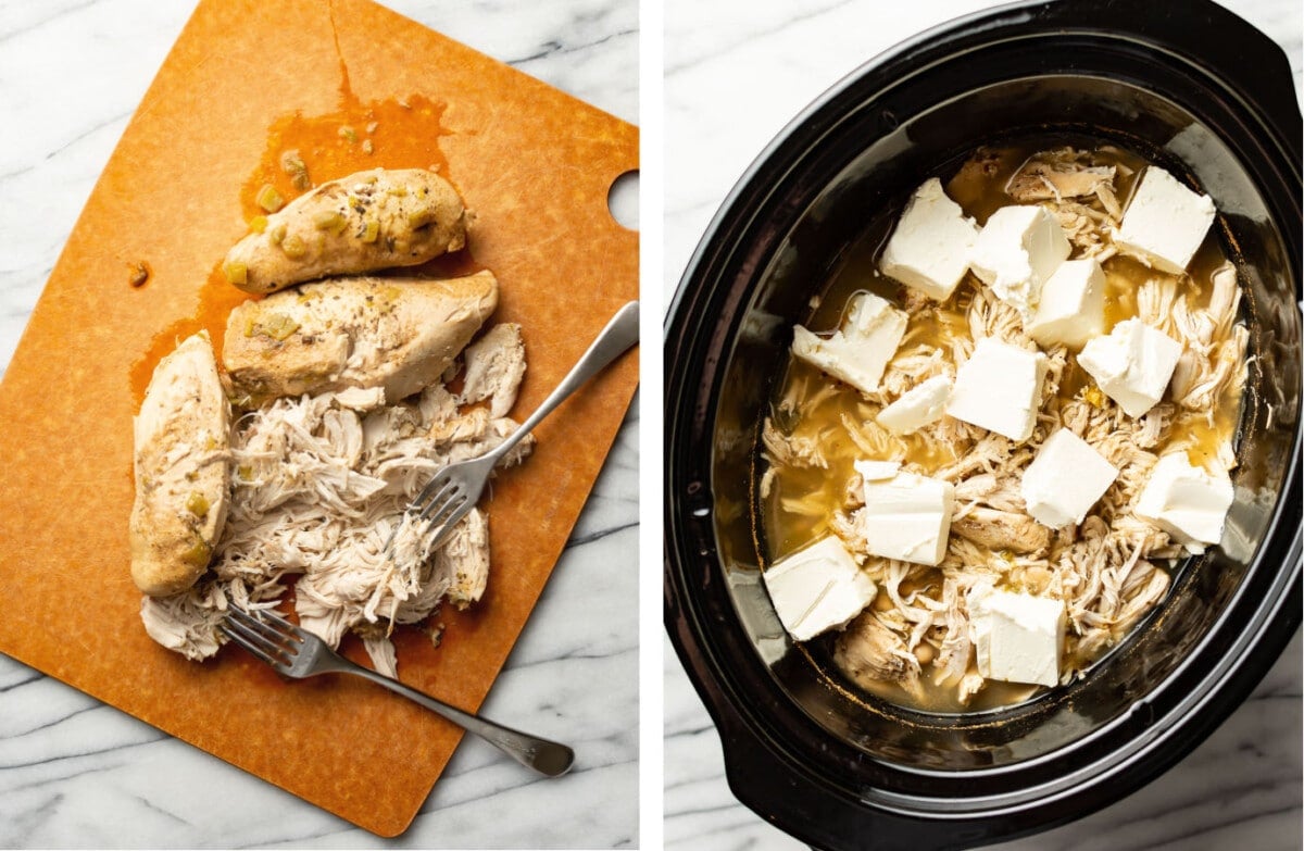 Transfer the chicken to a cutting board, shred/cut it up, then return it to the slow cooker. Microwave the cream cheese until softened, then cut it into cubes. Add to the Crockpot.